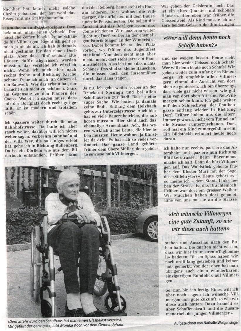 Seit Anfang Jahr lebt die 93-jährige Monika Koch im Reusspark in Niederwil. Erstmals wohnt sie ausserhalb von Villmergen. Auf einem Spaziergang durch das Dorf erzählt sie, wie sie die Entwicklung ihres Heimatdorfes wahrnimmt.