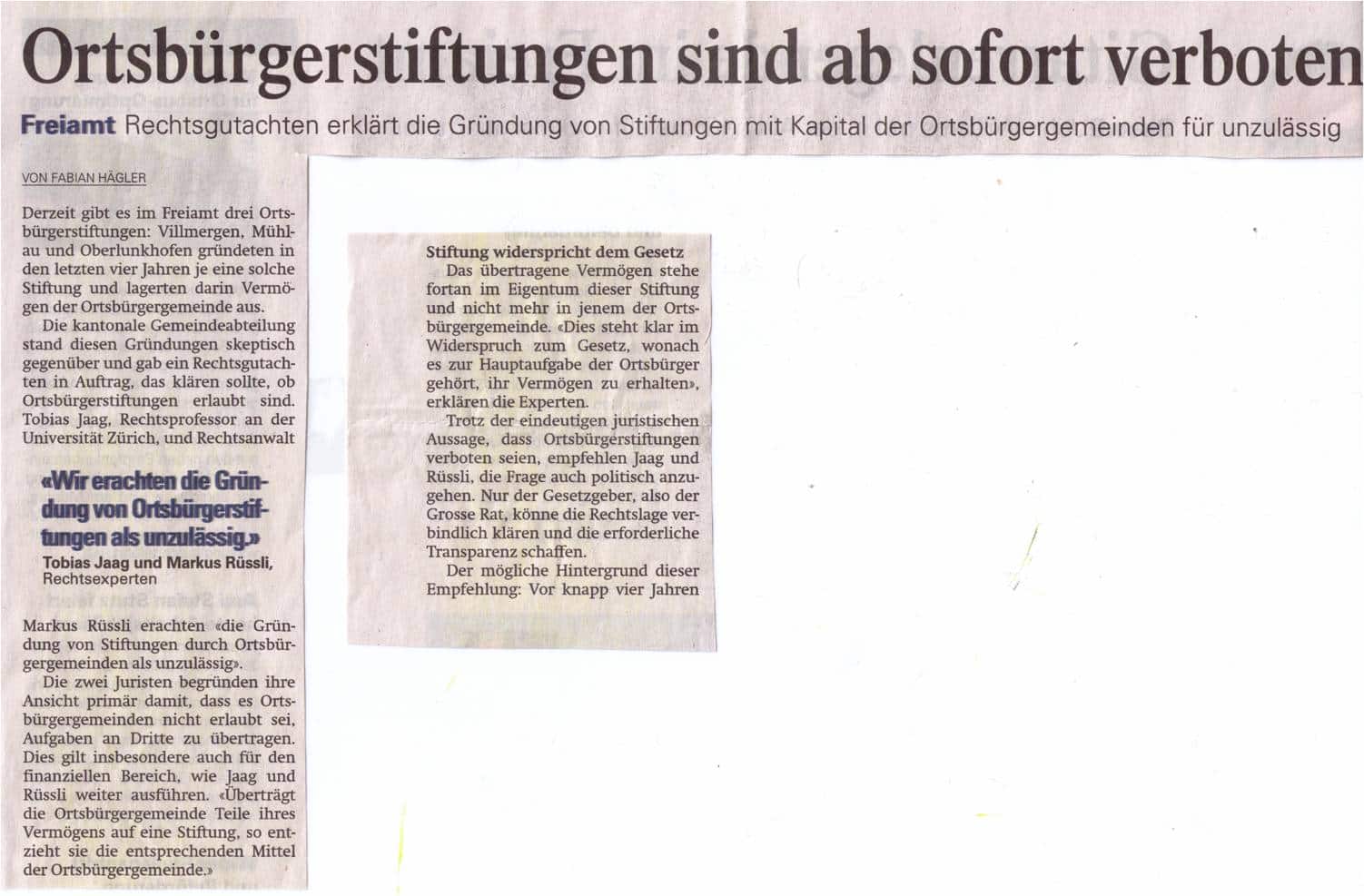 Derzeit gibt es im Freiamt drei Ortsbürgerstiftungen: Villmergen, Mühlau und Oberlunkhofen gründeten in den letzen vier Jahren je eine solche Stiftung und lagerten darin Vermögen der Ortsbürgergemeinde aus.