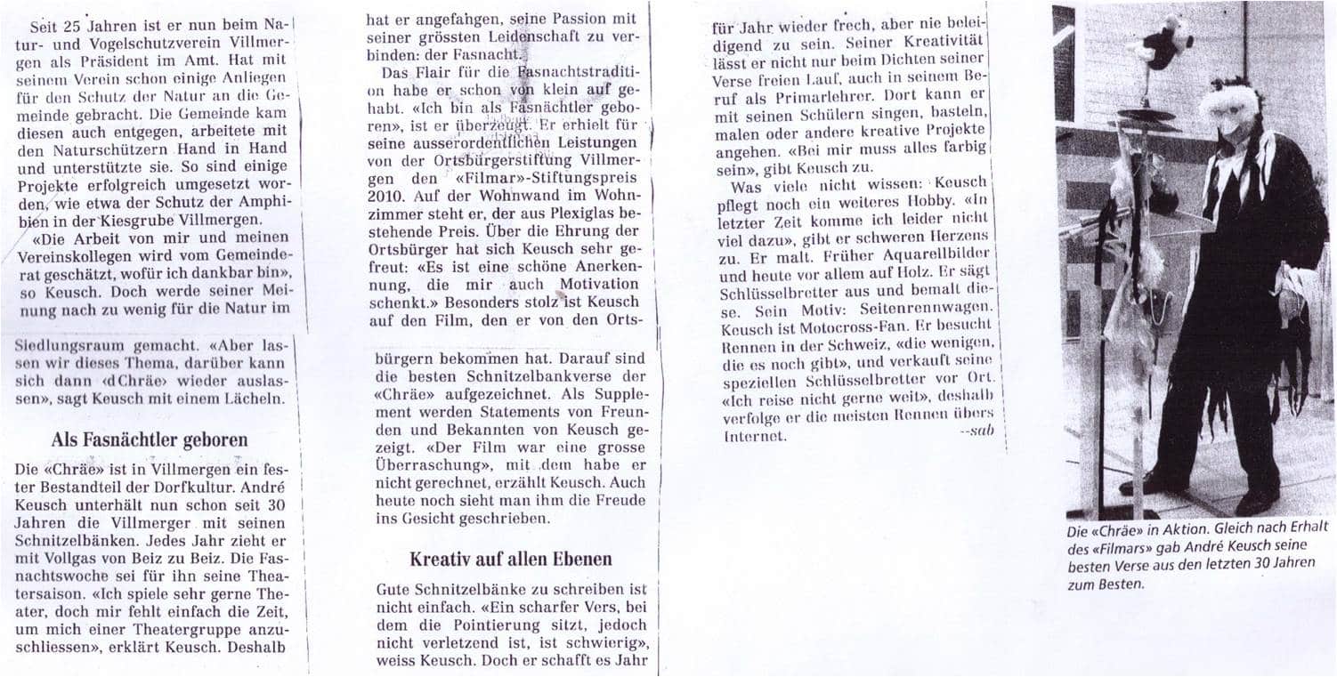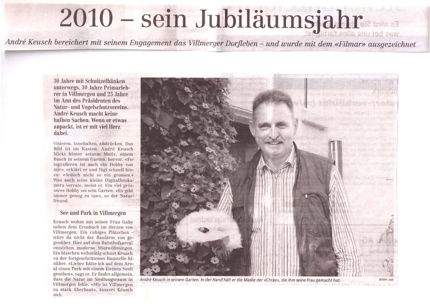 30 Jahr mit Schnitzelbänken unterwegs, 30 Jahfre Primarlehrer in Villmergen und 25 Jahre im Amt des Natur- und Vogelschutzvereins. AndrèKeusch macht keine halben Sachen. Wenn er etwas anpackt, ist er mit viel Herz dabei.