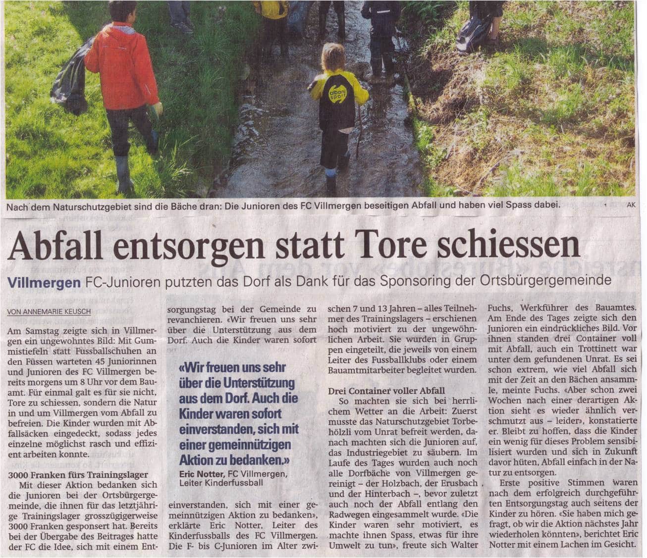Mit Gummistiefeln statt Fussballschuhen an den Füssen warteten rund 45 Juniorinnen und Junioren des FC Villmergen breits morgens um 8 Uhr vor dem Bau amt. Für einmal galt es für sie nicht, Tore zu schiessen, sondern die Natur in und um Villmergen vom Abfall zu befreien.