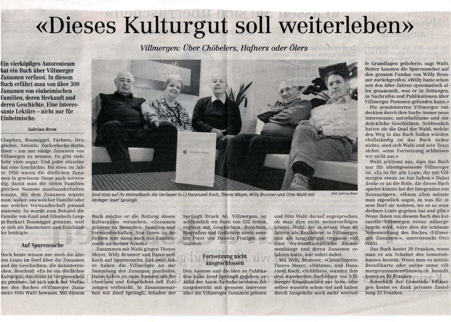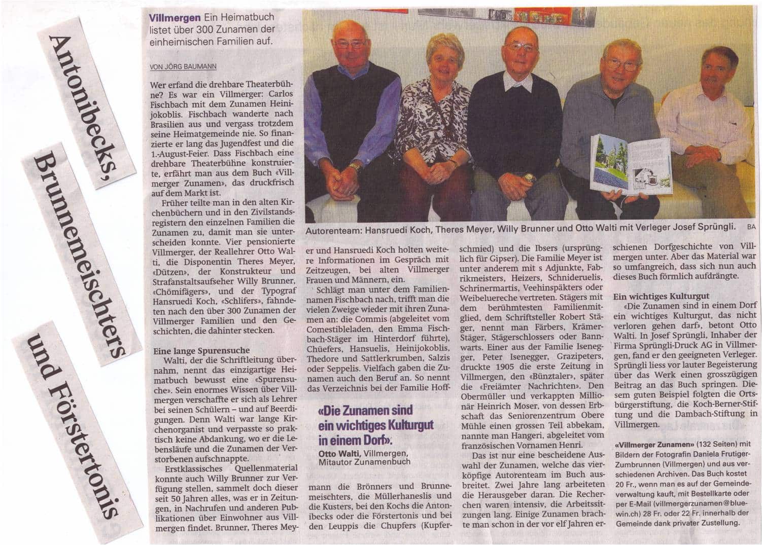 Ein vierköpfiges Autorenteam hat ein Buch über Villmergen verfasst. In diesem Buch erfährt man von über 300 Zunamen von einheimischen Familien, deren Herkunft und deren Geschichte. Eine interes sante Lektüre – nicht nur für Einheimische.