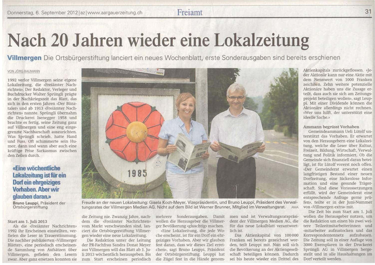 Die Umfrage bei der Bevölkerung im Dezember 2010 und bei Firmen und Vereinen im 2011 brachte ein klares Ergebnis: Villmergen will wieder eine eigene Dorfzeitung. Seit der Einstellung der „Freiämter Nachrichten“ vor einigen Jahren fehlt ein eigenes Lokalblatt. Die Arbeitsgruppe der Ortsbürgerstiftung ist nun, nach gut einem Jahr intensiver Planung und Abklärungen, wesentliche Schritte weiter gekommen.