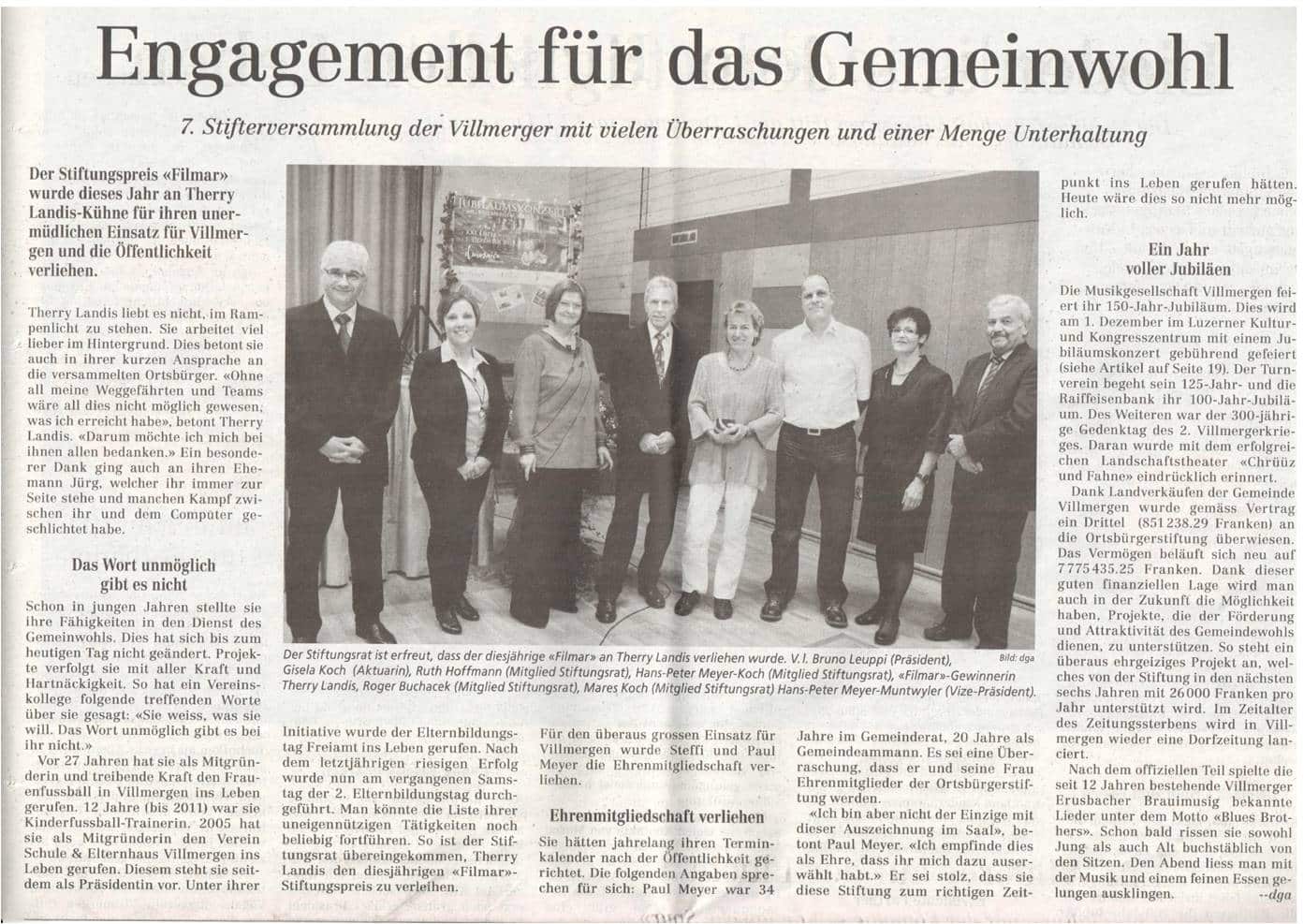 Der Stiftungspreis „Filmar“ wurde dieses Jahr an Therry Landis-Kühne für ihren unermüdlichen Einsatz für Villmergen und die Öffentlichkeit verliehen.
