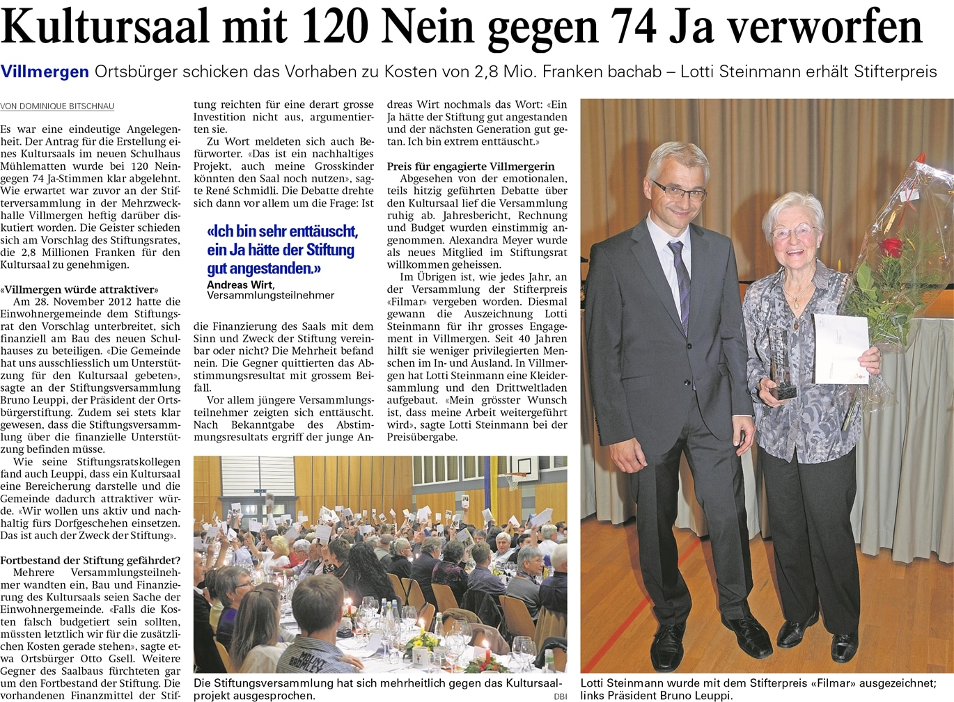 Die Stifterversammlung lehnte mit 120:74 den Bau des Kultursaals ab. Der Abstimmung ging eine lange und engagierte Diskussion voraus. Diese zeigte, dass eine Mehrheit der Ortsbürger nicht bereit ist, 2,8 Millionen Franken für ein Bauwerk zu sprechen, das der Allgemeinheit zu Gute kommt.